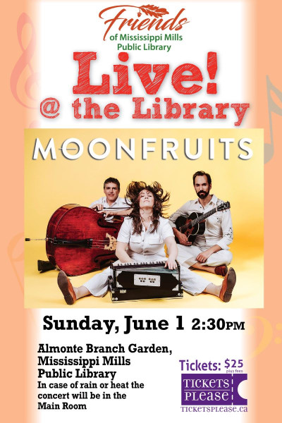 Sunday, 1 June at 2:30 pm, in the Almonte branch gardens or, if the weather is inclement, indoors in the main room. Tickets at TicketsPlease.ca : https://fomml.ticketsplease.ca/product/live-the-library-moonfruits/