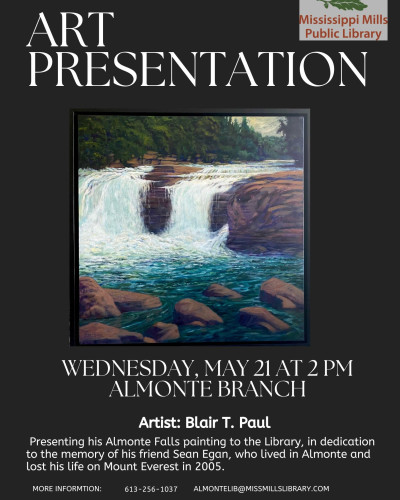 Local artist Blair Paul presents his painting Almonte Falls to the library in dedication to the memory of his friend, Sean Egan. 21 May at 2pm, Almonte branch.