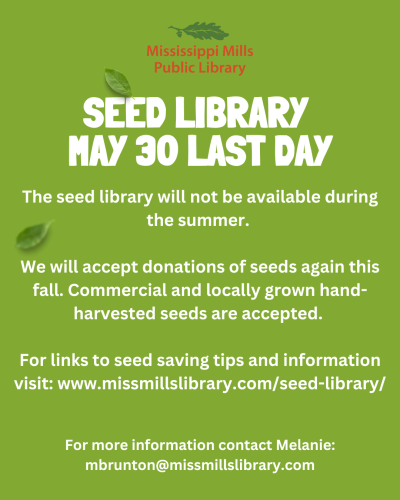 Seed donations (viable commercial & hand-harvested) are accepted again starting Fall 2025. For info about how to harvest seeds, visit: https://www.missmillslibrary.com/seed-library or contact Melanie: mbrunton@missmillslibrary.com