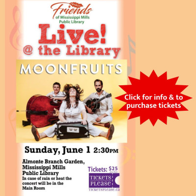 This Sunday!! Bring a lawn chair and settle in for an afternoon of gorgeous harmonies and creative folk vibes as Moonfruits bring their Slow Touring Pilot Project to the Almonte Library garden. Don’t miss this magical outdoor show! Tickets: https://fomml.ticketsplease.ca/product/live-the-library-moonfruits/