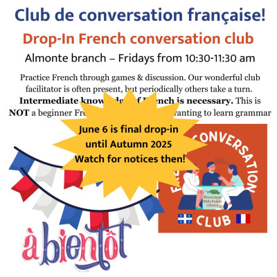 Last drop-in French club is Friday, 6 June from 10:30-1130am. Club will resume in the Autumn.