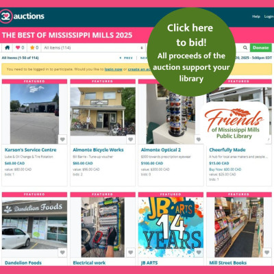 The Friends of the Mississippi Mills Public Library auction – The Best of Mississippi Mills – is on! See all the services and experiences on auction at: www.32auctions.com/FMMPL2025 You need to login to bid – it’s super easy and all proceeds support library programs! Thank you everyone!