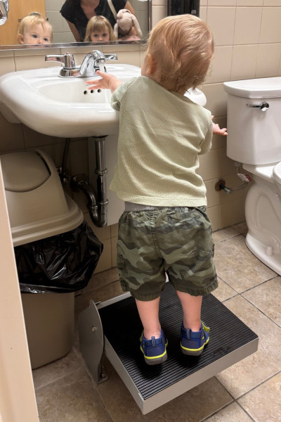 Our new little stool in the washroom at Almonte branch is very popular! This little guy was thrilled to be able to wash his hands on his own (photo shared with permission).