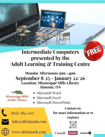 The Adult Learning & Training Centre, Lanark, is offering an Intermediate Computer Course on Monday afternoons at Almonte branch library from September 8, 2025- January 22, 2026. Registration is required via the ALTC – email info@altclanark.com or phone the centre at 613-284-2121 for all details and to register.
