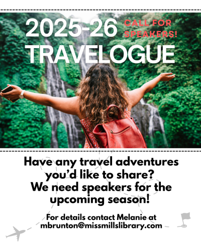Generally an MMPL evening Travelogue is an hour presentation + time for Q&A, but for ALL the DETAILS contact Melanie mbrunton@missmillslibrary.com
