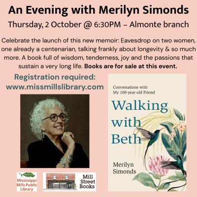 Merilyn Simonds is back at Almonte branch with her latest book – Walking with Beth. Thurs., 2 October at 6:30pm. This event is in partnership with Mill Street Books, books will be on sale at the event. Registration required: https://form.jotform.com/252396524760260