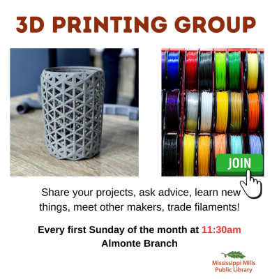 Curious about 3D printing or already have a printer at home? Join us for our monthly 3D Printing Group, 1st Sunday of every month, 11:30 AM, Almonte branch meeting room. This free and welcoming group is open to everyone—whether you’re just getting started or have years of experience. It’s a relaxed and friendly environment where you can share your current projects, get advice on printers and filaments, troubleshoot problems, or simply enjoy chatting with others who share your interest. No registration needed—just drop in and say hello!