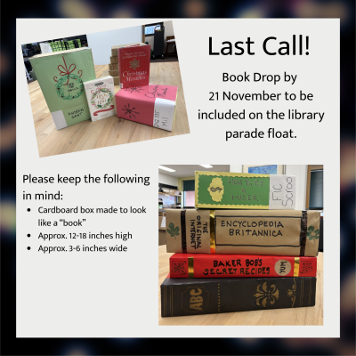 December 6 & 7 are also the dates for the Pakenham and Almonte parades! Last call to drop off your homemade “books” to be featured on the library float! We have books from our own collection, “The Original Internet” Encyclopedia Britannica, and we’re thrilled to have a copy of Baker Bob’s Secret Recipes!