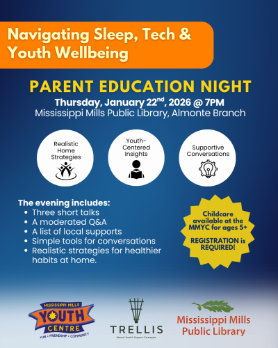 Hosted in partnership with the Mississippi Mills Youth Centre (MMYC) and Trellis Mental Health, this event is designed to help parents better understand how sleep, technology use and mental health are connected for youth today. The evening will include three short presentations sharing local data and insights, youth perspectives, and guidance from a local mental health provider, followed by a moderated Q&A. The focus of the evening is on realistic, relationship-based approaches that help parents feel confident, informed and connected, have conversations and set boundaries.