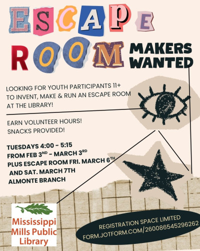 Almonte Branch – Tuesdays, February 3rd – March 3rd from 4:00 – 5:15pm, PLUS flexibility for Escape Room set up & operation March 6 –7. Space is limited – register now https://form.jotform.com/260086545296262