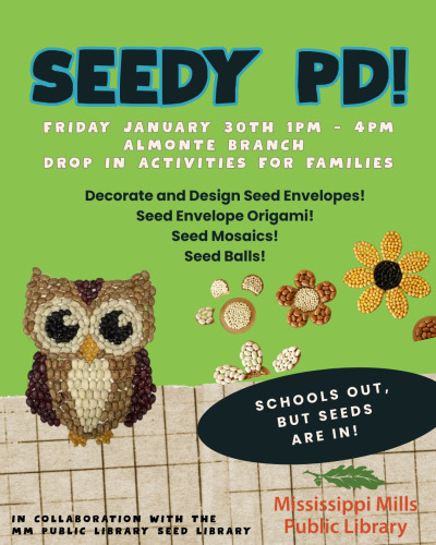 School is OUT, but seeds are IN! Come join us for a SEEDY PD. Families are welcome to drop in anytime 1-4pm on January 30th at the Almonte branch for crafts, and activities in collaboration with our Seed Library. Participants of all ages can help decorate and design seed envelopes, learn how to fold origami seed envelopes, sort seeds, make seed mosaics and learn about what is sleeping under the ground.