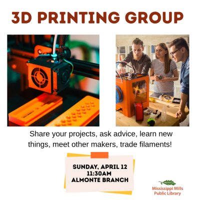 3D Printing Group will meet Sunday, April 12 at 11:30am – Almonte Branch due to the Easter holiday weekend. This group normally meets the first Sunday of the month.