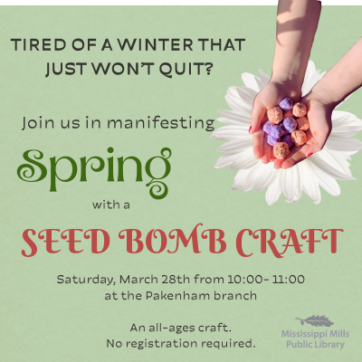 All Ages Craft this Saturday, March 28! Tired of a winter that just won’t quit?! Join us in manifesting spring with a Seed Bomb Craft at the Pakenham Branch from 10:00-11:00am. Drop in! No registration required.