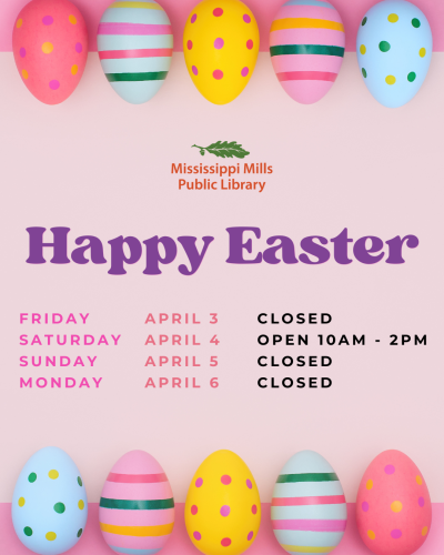 Easter is almost here! Please note that both branches of MMPL will be CLOSED April 3, 5 & 6 and OPEN April 4, for regular Saturday hours from 10:00am – 2:00pm. Now is the time to hop on in to stock up on your favourite books, puzzles, board games and more!
