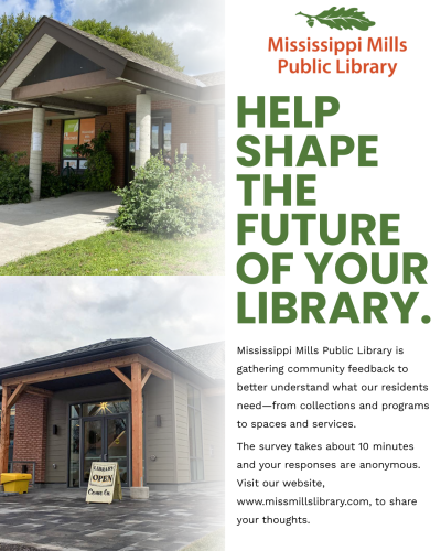 Help Shape the Future of Your Library. The Mississippi Mills Public Library and its Board of Directors are looking for community feedback on everything from collections and programs to spaces and services. Please take a few moments to complete this survey! https://tinyurl.com/2tdhm6ev