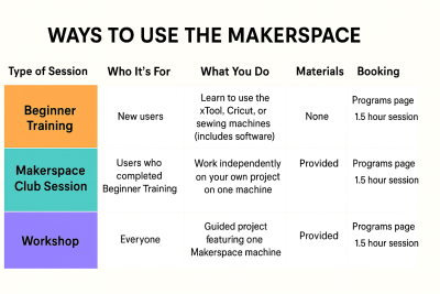 Visit the MMPL programs & events page for info about booking FREE training or work time at the Makerspace.